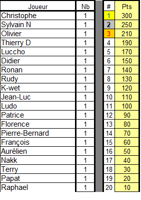 Un revenant en la personne de Christophe, alias Kinou alias BeepBeep alias FilelleMute qui nous a fait l'honneur de sa présence et de son savoir! Car il a tout simplement marché sur toutes les tables où il a joué! Variant entre la réussite et le savoir-faire, il a éclaboussé de son talent ce 272ième tournois de l'Aspt.