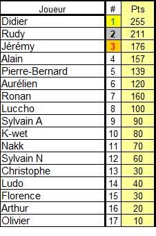 Au final, Didier s'impose face à Rudy dans un Head's Up d'anthologie de presqu'une heure! Il remporte son cinquième tournoi de l'Aspt, après une disette de presque 2 ans! Lui, le double champion Aspt Live et champion Online! Une victoire encore plus étincelante quand on sait qu'il ne lui restait qu' une blinds à 5 joueurs restants. Il triple avec 63off avec le 3 river! Ensuite c'est la remontada historique pour commencer le HU en tête, passer dérrière puis revenir et enfin l'emporter! Une victoire pleine d'expérience qui n'est pas s'en rapeller ses grandes heures de gloire! En espérant que ça continue et qu'on le retrouve à la bagarre pour la victoire finale! C'est plutôt bien partie puisqu'il se retrouve en quatrième position au classement à seulement 65 points du leader. Jérémy complète le podium, après une partie en réussite mais avec de bonnes décisions! Un joueur intéressant qui devrait, avec de plus de régularité aux parties, devenir un prétendant sérieux pour le titre.