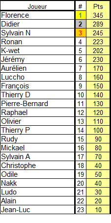 Didier confirme son regain de forme : une 2ème place après sa victoire lors de la précédente partie. Sylvain N. complète le podium.