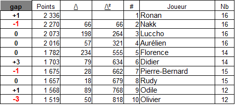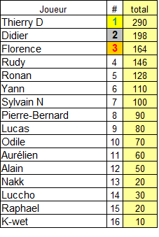 Mention spéciale pour Nakk, Ronan, Odile et Christophe qui remportent deux tournois cette saison! Aurélien, Florence, Didier, Pierre-Bernard, Olivier, Thierry D, Patrice et Wiliam remportent un tournoi cette saison.