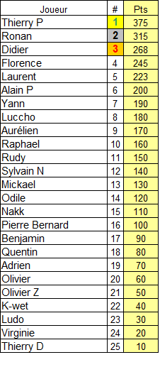 Un immense bravo mon Thierry! Tu tournais autour depuis quelque temps, mais les cartes te faisaient défaut sur la fin! Cette fois c'est la bonne et je t'en souhaite bien d'autre! Une victoire en HU face à notre champion en titre Ronan qui se place enfin dans la course à sa propre succession! Didier complète le podium et confirme la bonne forme du moment. Cette victoire le propulse Thierry P dans le top 10 avec un joli +15 au classement général!