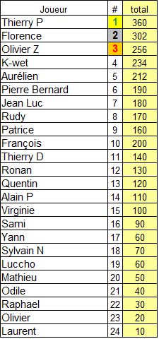 Un énorme bravo pour cette magnifique victoire acquise au profit de Florence qui aura bien survécu tout au long de la TF. Olivier Z complète le podium pour la première fois de la saison.
