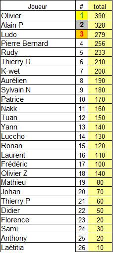 Au classement général, Florence perd la 1ère place et chute en troisième position doublée par Yann et Aurélien. C'est donc Aurélien, qui a force de régularité, s'empare du trône à 4 tournois de la fin! Une fin de saison qui s'annonce folle tellement l'écart est serré entre les 6 premiers!